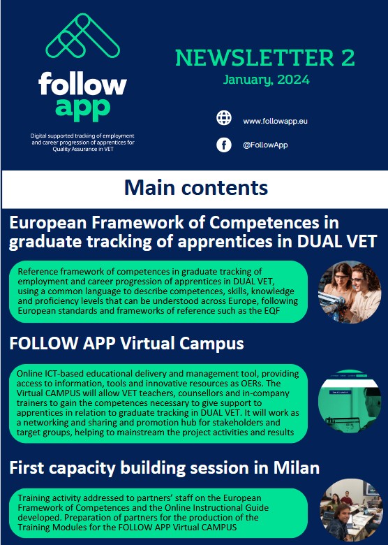 The second newsletter covers the launch of the FOLLOW APP European Competence Framework—an essential tool for VET professionals aiming to implement graduate tracking systems. It also provides details about the design of the Virtual Campus and the joint training event held in Milan, where partners collaborated on content development.