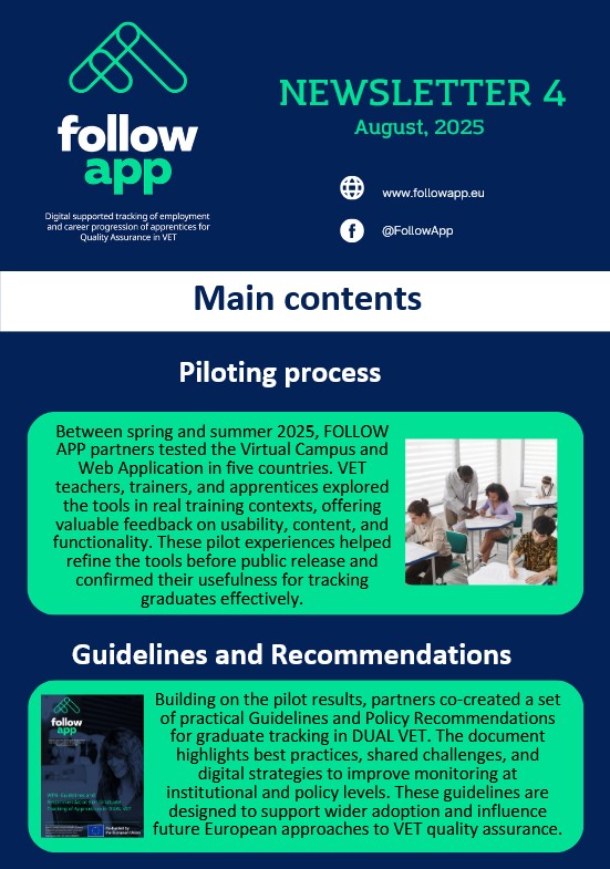 The fourth newsletter showcases how the digital tools developed by FOLLOW APP (online platform, mobile app, awareness materials, and courses) are being used and valued by VET centres. It includes testimonials, examples of practical use, and upcoming steps for further dissemination.
